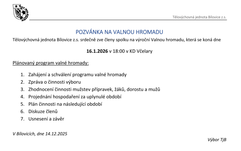 Tělovýchovná jednota Bílovice z.s. srdečně zve členy spolku na výroční Valnou hromadu, která se koná dne: 16.1.2026 v 18:00 v KD Včelary